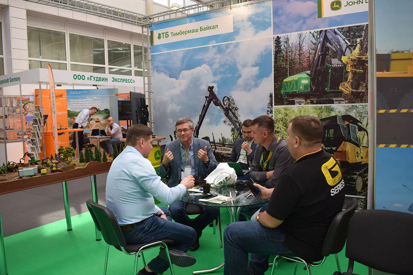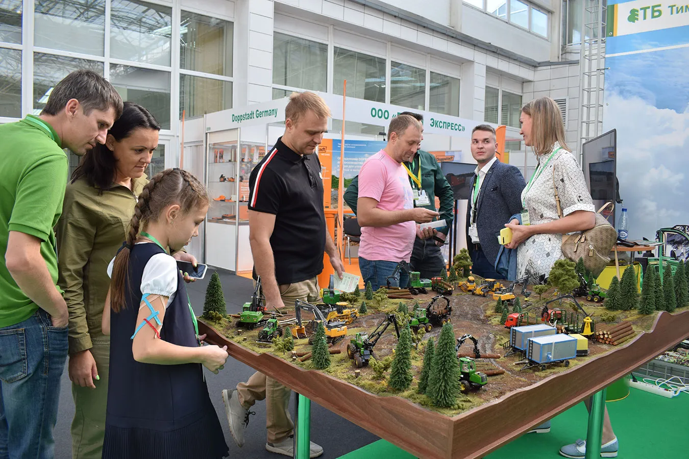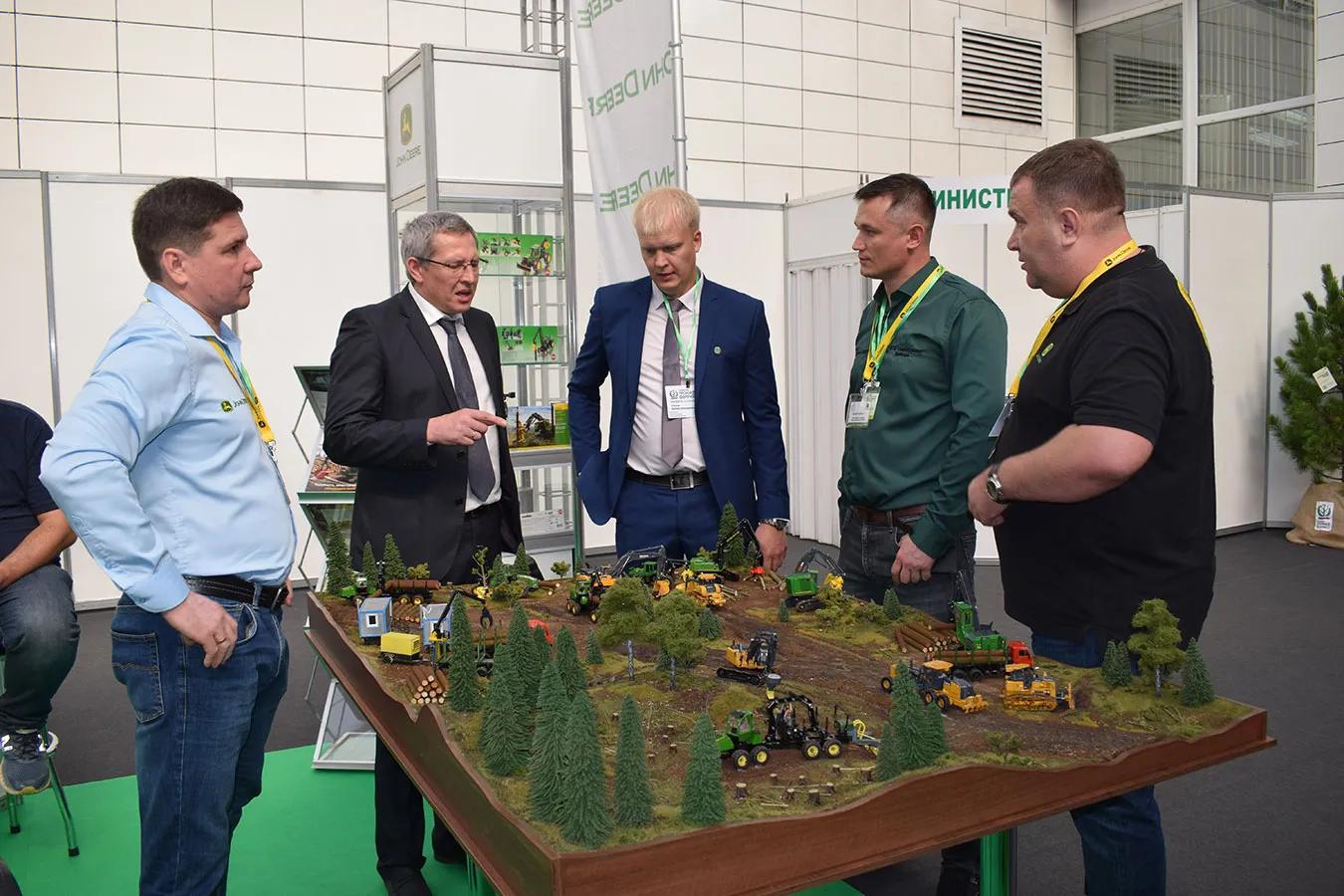 Безусловный интерес гостей мероприятия вызвал макет в масштабе 1:50, на котором мы показали виды работ, которые может выполнять лесозаготовительная и дорожно-строительная техника John Deere, оборудование для лесовосстановления Bracke Forest, погрузочно-разгрузочное оборудование Rotobec.